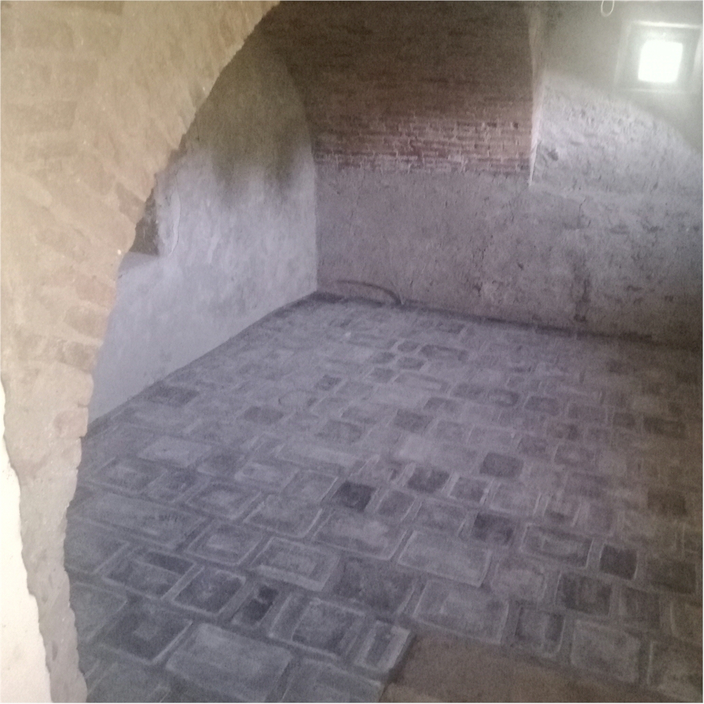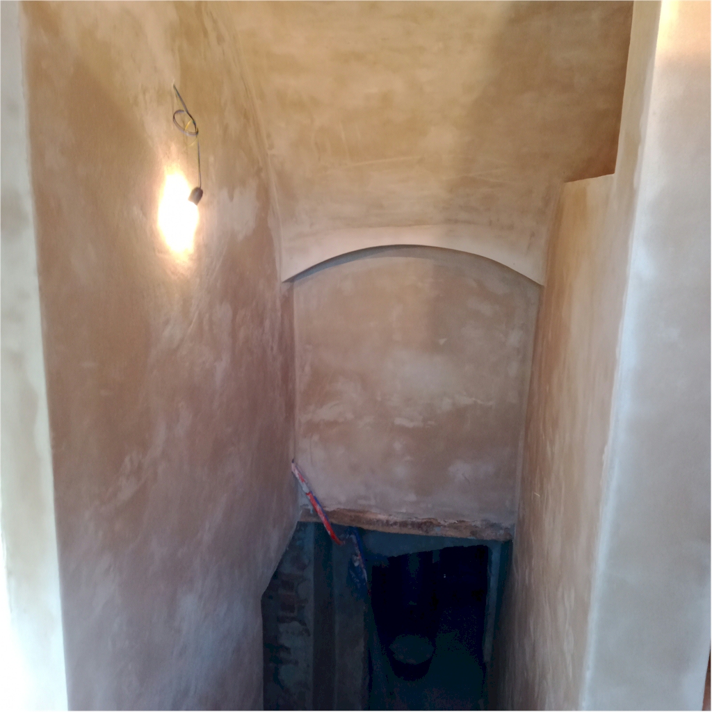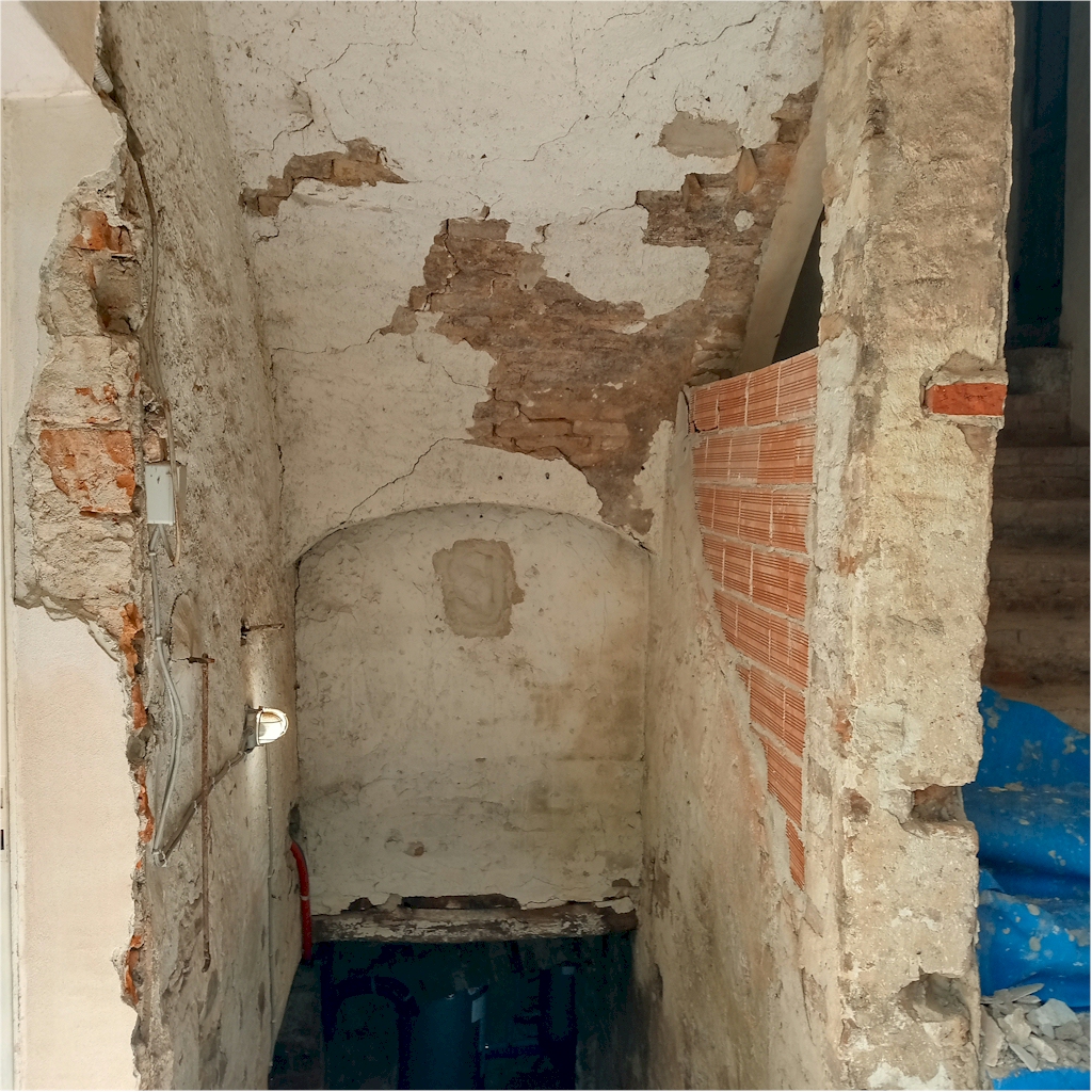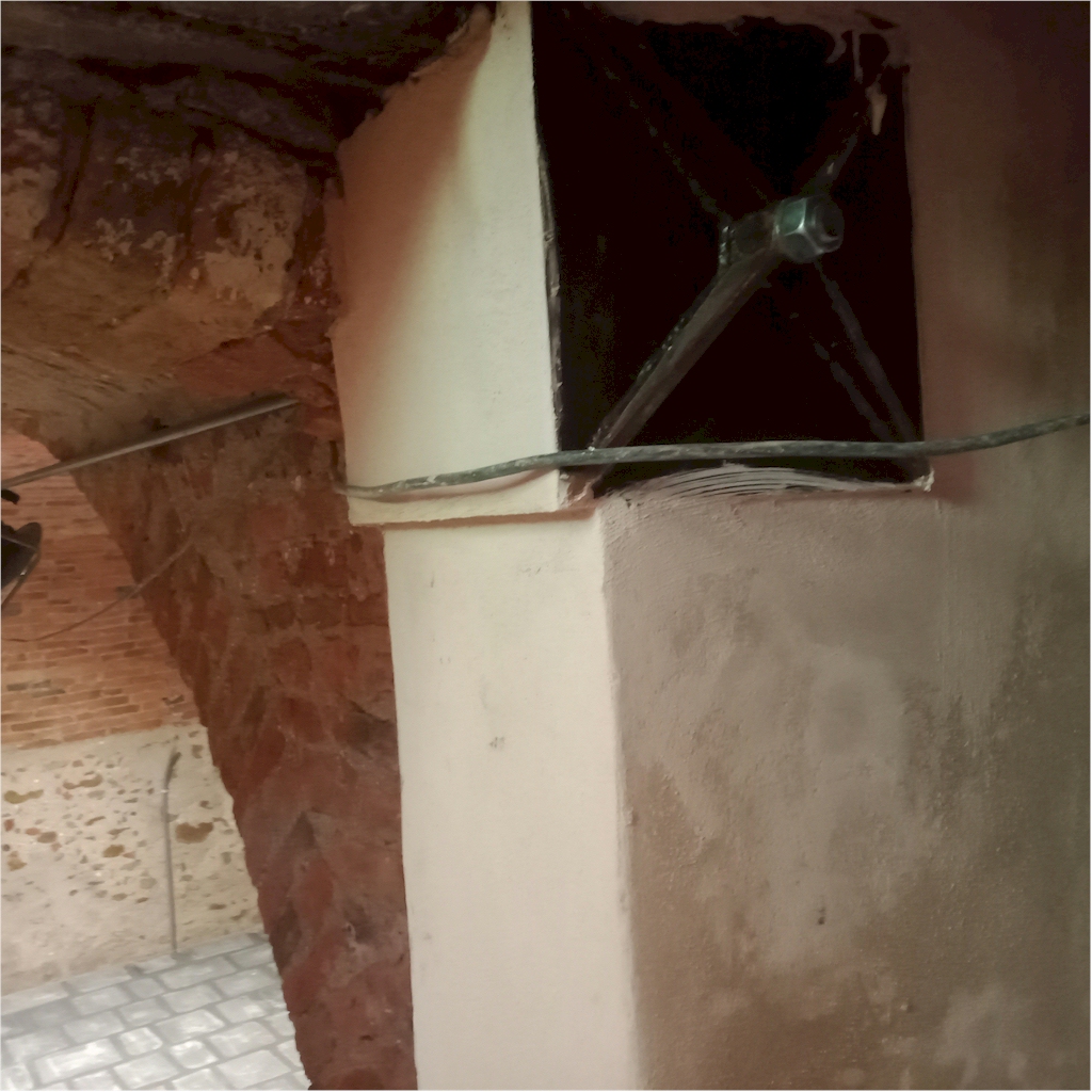 Un elemento affascinante dell’edificio è rappresentato dalla grande cantina con volta a botte in mattoni. Sono state eseguite la pulitura della volta della cantina mediante sabbiatura a bassa pressione e il consolidamento mediante inserimento di due catene in ferro con sistema di tiraggio in bulloni e piastre.